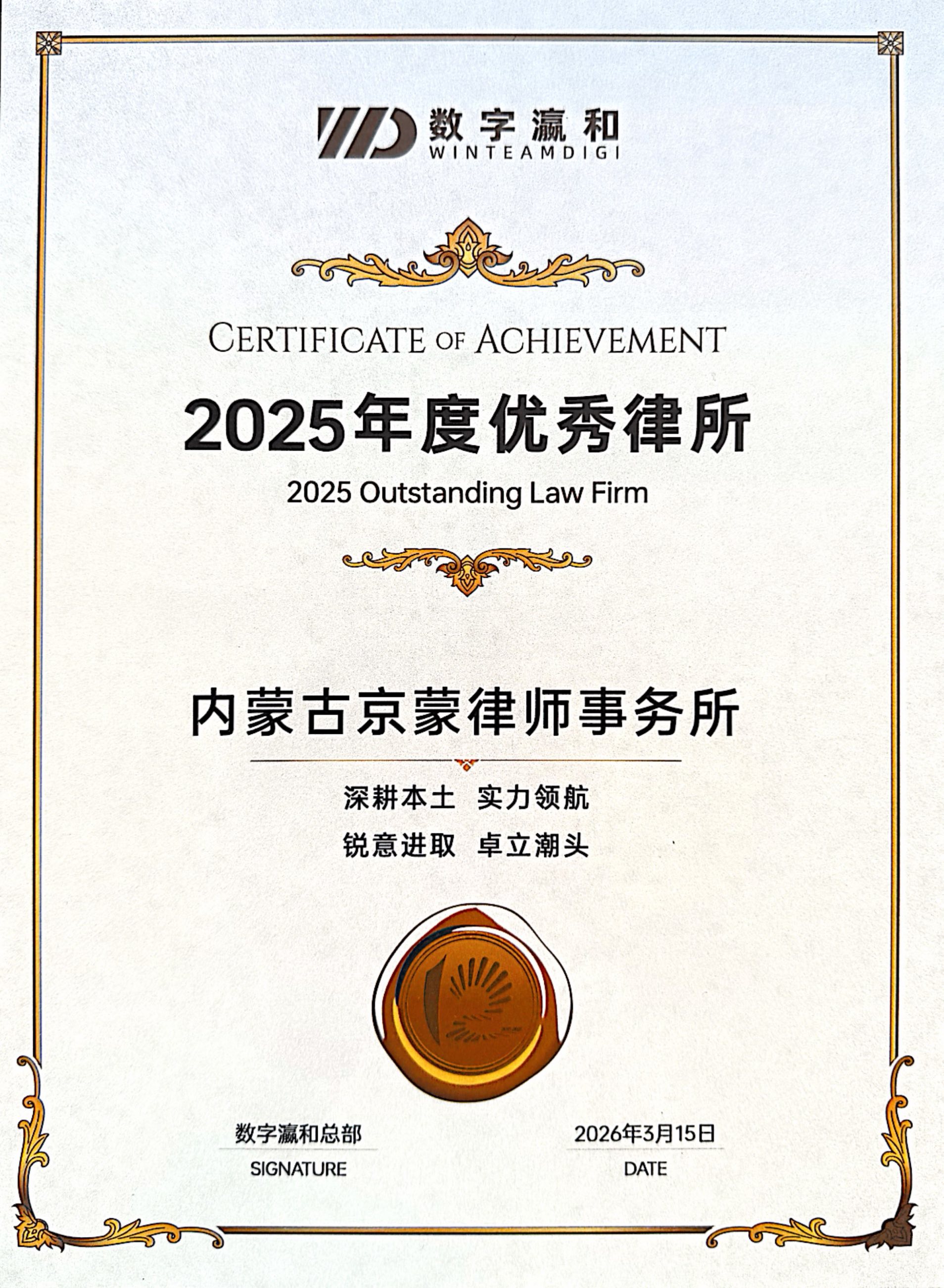 喜报|内蒙古京蒙律师事务所事务所荣获数字瀛和“2025年度优秀律所”称号